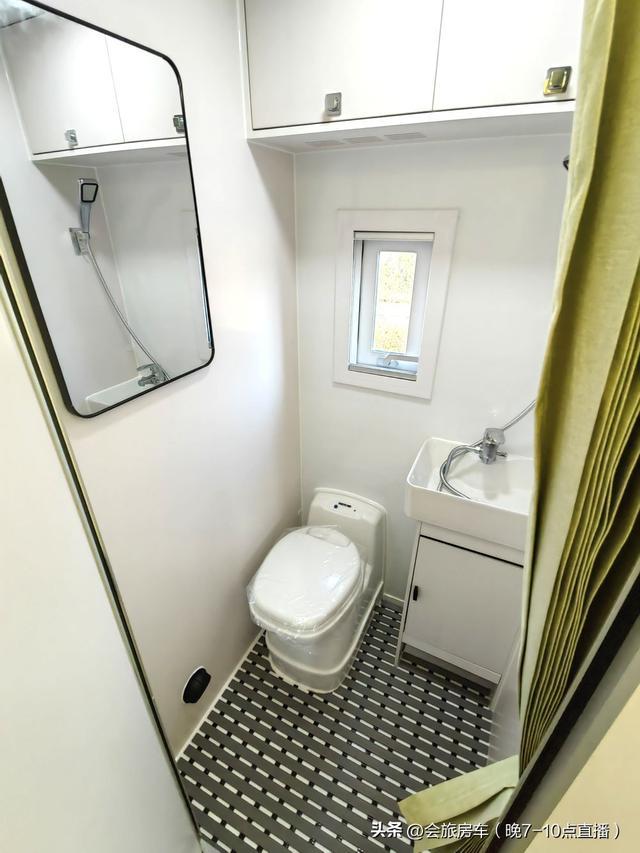 卫生间为独立空间,内部配有固定抽拉马桶,可选便携马桶,还配有淋浴花洒、洗手盆、衣帽镜、防滑垫和双下水地漏,侧面加装了暖风出风口。