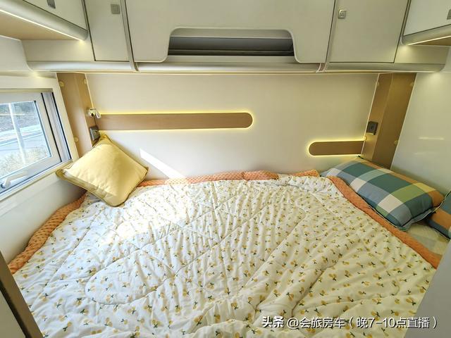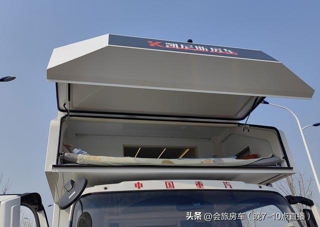 后部是休息区,一张横置大床可以睡下两人,前部是额头大床,尺寸为2.3*1.3米,最高处能到86公分,打开额头后,能坐在上面。额头打开后,前部驾驶室可以翻转抬起,维修保养方便。